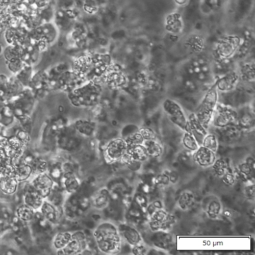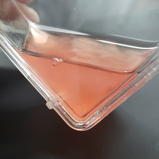 このタイプのコンタミでは、培地が濁ったり、培地の色(主にフェノールレッドなどのpH指示薬)が急に変わったり、ホコリのようなものが浮いていたりと、目で見て気づくことができます。