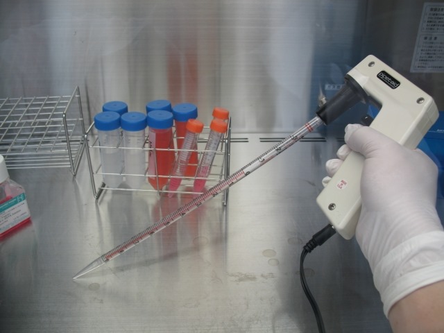 また溶液を取り扱う器具(ピペット)の先端がクリーンベンチの一部に触れてしまうことも危険です。もし、触れた箇所に微生物が落ちてきていたとしたら…器具を通して溶液を入れると一緒に微生物も入り込んでしまいます。