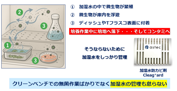 インキュベーター内には湿度を保つための加湿水が置かれていることがありますが、この水が微生物の温床になるケースが多いのです。