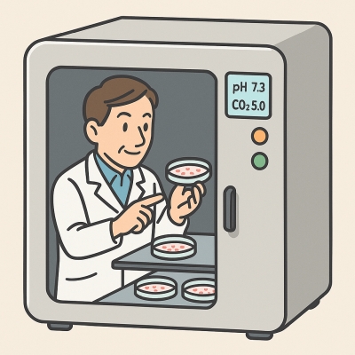 細胞の培養に最適なpHを維持して、「細胞を元気に育てるためには、CO₂濃度の維持も欠かせない」のです。湿度の管理も大切
