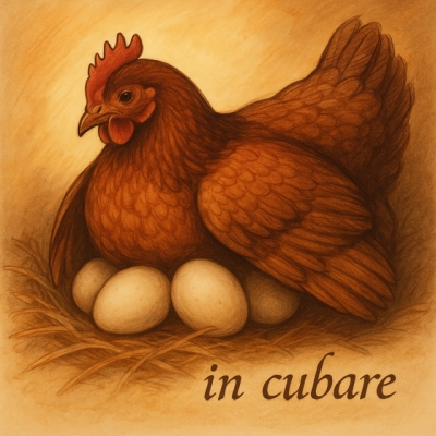 これは「〜の上に」の in と、「横たわる」の cubare から「卵を抱いて温める」という意味があります。