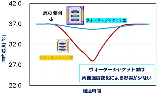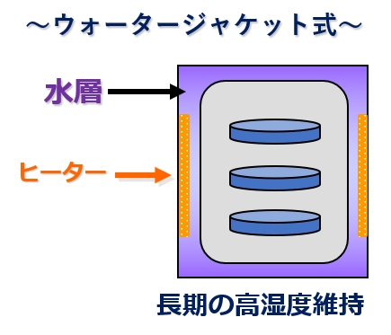 ウォータージャケット型は、チャンバーの外側を温水が取り囲む構造で、温度変動が極めて少なく、長時間安定した培養条件が保てるという特徴があります。